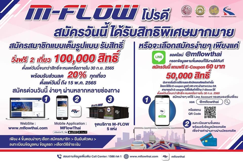 www.mflowthai.com หรือ Mobile Application : Mflow นอกจากนี้ ยังสามารถสมัครได้ง่ายๆ ภายใน 2 นาที ผ่าน Line Official Account : @mflowthai ส่วนลูกค้าที่ใช้บริการ M-Pass และ Easy Pass อยู่แล้ว สามารถสมัครสมาชิกและระบุช่องทางให้ชำระค่าบริการผ่านบัตรได้เลยเช่นกัน ผู้สนใจสอบถามข้อมูลเพิ่มเติมได้ที่ Call Center 1586 กด 1 ได้ตลอด 24 ชั่วโมง