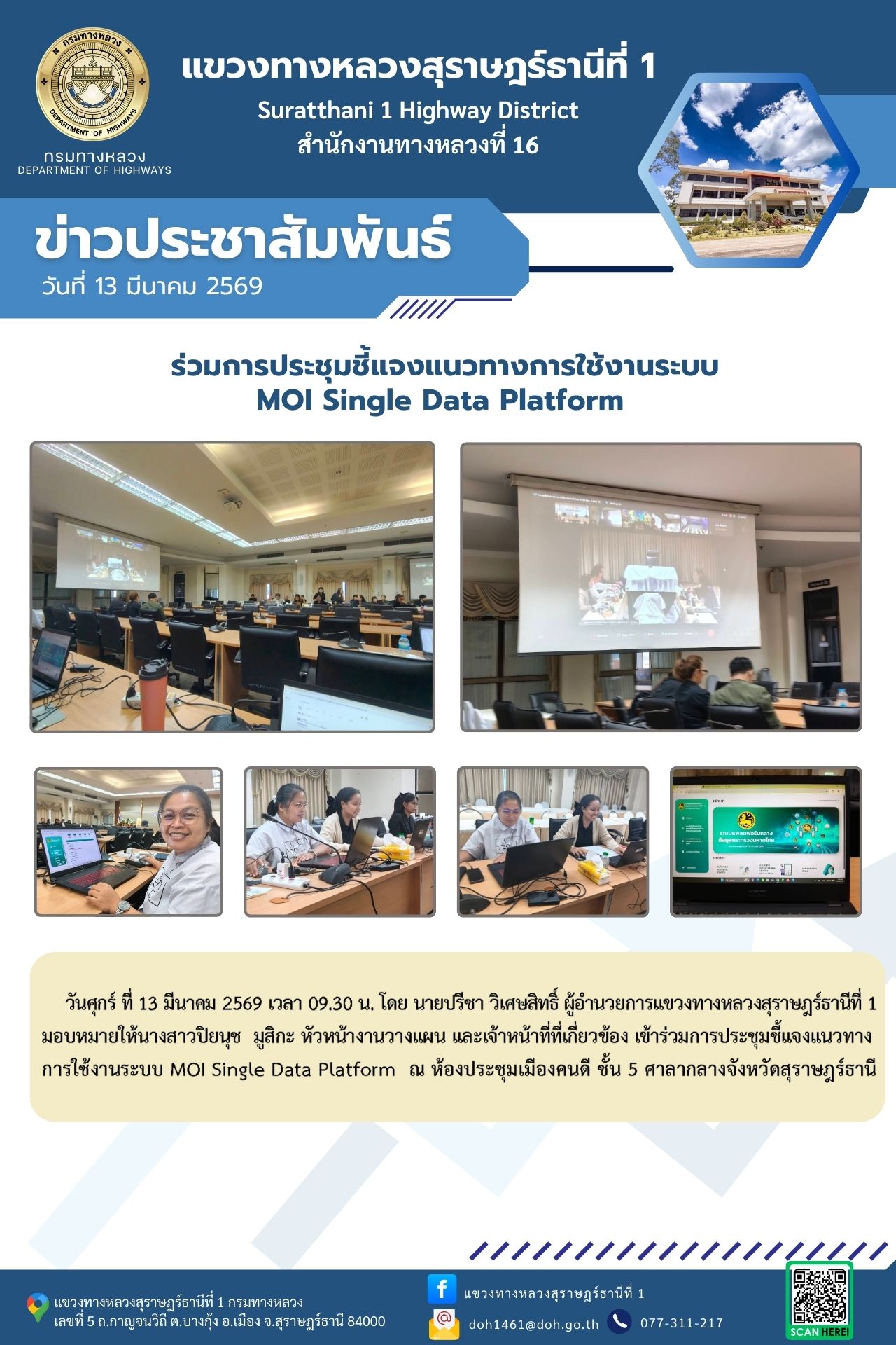 วันศุกร์ ที่ 13 มีนาคม 2569 เวลา 09.30 น. โดย นายปรีชา วิเศษสิทธิ์ ผู้อำนวยการแขวงทางหลวงสุราษฎร์ธานีที่ 1 มอบหมายให้นางสาวปิยนุช มูสิกะ หัวหน้างานวางแผน และเจ้าหน้าที่ที่เกี่ยวข้อง เข้าร่วมการประชุมชี้แจงแนวทางการใช้งานระบบ MOI Single Data Platform ณ ห้องประชุมเมืองคนดี ชั้น 5 ศาลากลางจังหวัดสุราษฎร์ธานี