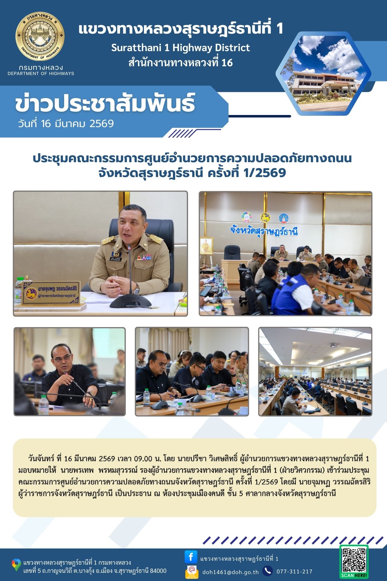 วันจันทร์ ที่ 16 มีนาคม 2569 เวลา 09.00 น. โดย นายปรีชา วิเศษสิทธิ์ ผู้อำนวยการแขวงทางหลวงสุราษฎร์ธานีที่ 1 มอบหมายให้ นายพรเทพ พรหมสุวรรณ์ รองผู้อำนวยการแขวงทางหลวงสุราษฎร์ธานีที่ 1 (ฝ่ายวิศวกรรม) เข้าร่วมประชุมคณะกรรมการศูนย์อำนวยการความปลอดภัยทางถนนจังหวัดสุราษฎร์ธานี ครั้งที่ 1/2569 โดยมี นายจุมพฏ วรรณฉัตรสิริ ผู้ว่าราชการจังหวัดสุราษฎร์ธานี เป็นประธาน ณ ห้องประชุมเมืองคนดี ชั้น 5 ศาลากลางจังหวัดสุราษฎร์ธานี