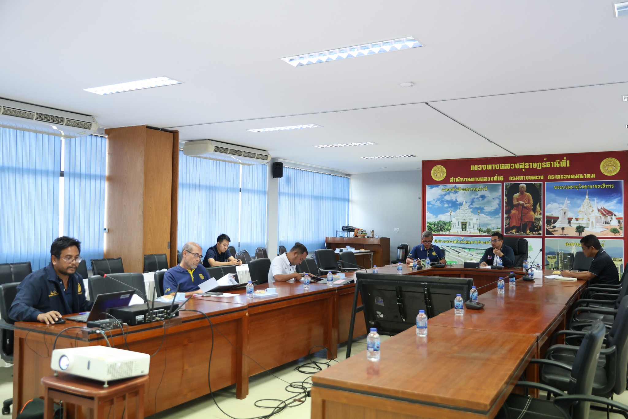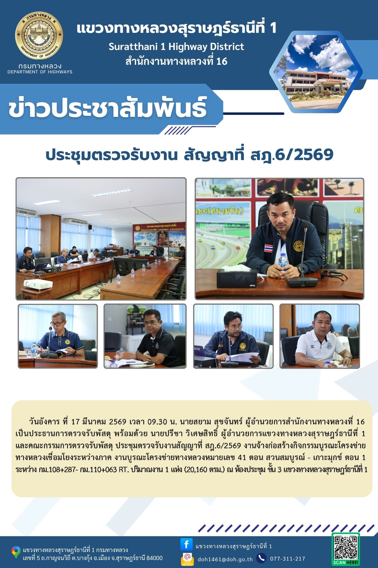วันอังคาร ที่ 17 มีนาคม 2569 เวลา 09.30 น. นายสยาม สุขจันทร์ ผู้อำนวยการสำนักงานทางหลวงที่ 16 เป็นประธานการตรวจรับพัสดุ พร้อมด้วย นายปรีชา วิเศษสิทธิ์ ผู้อำนวยการแขวงทางหลวงสุราษฎร์ธานีที่ 1 และคณะกรรมการตรวจรับพัสดุ ประชุมตรวจรับงานสัญญาที่ สฎ.6/2569 งานจ้างก่อสร้างกิจกรรมบูรณะโครงข่ายทางหลวงเชื่อมโยงระหว่างภาค งานบูรณะโครงข่ายทางหลวงหมายเลข 41 ตอน สวนสมบูรณ์ - เกาะมุกข์ ตอน 1 ระหว่าง กม.108+287- กม.110+063 RT. ปริมาณงาน 1 แห่ง (20,160 ตรม.) ณ ห้องประชุม ชั้น 3 แขวงทางหลวงสุราษฎร์ธานีที่ 1