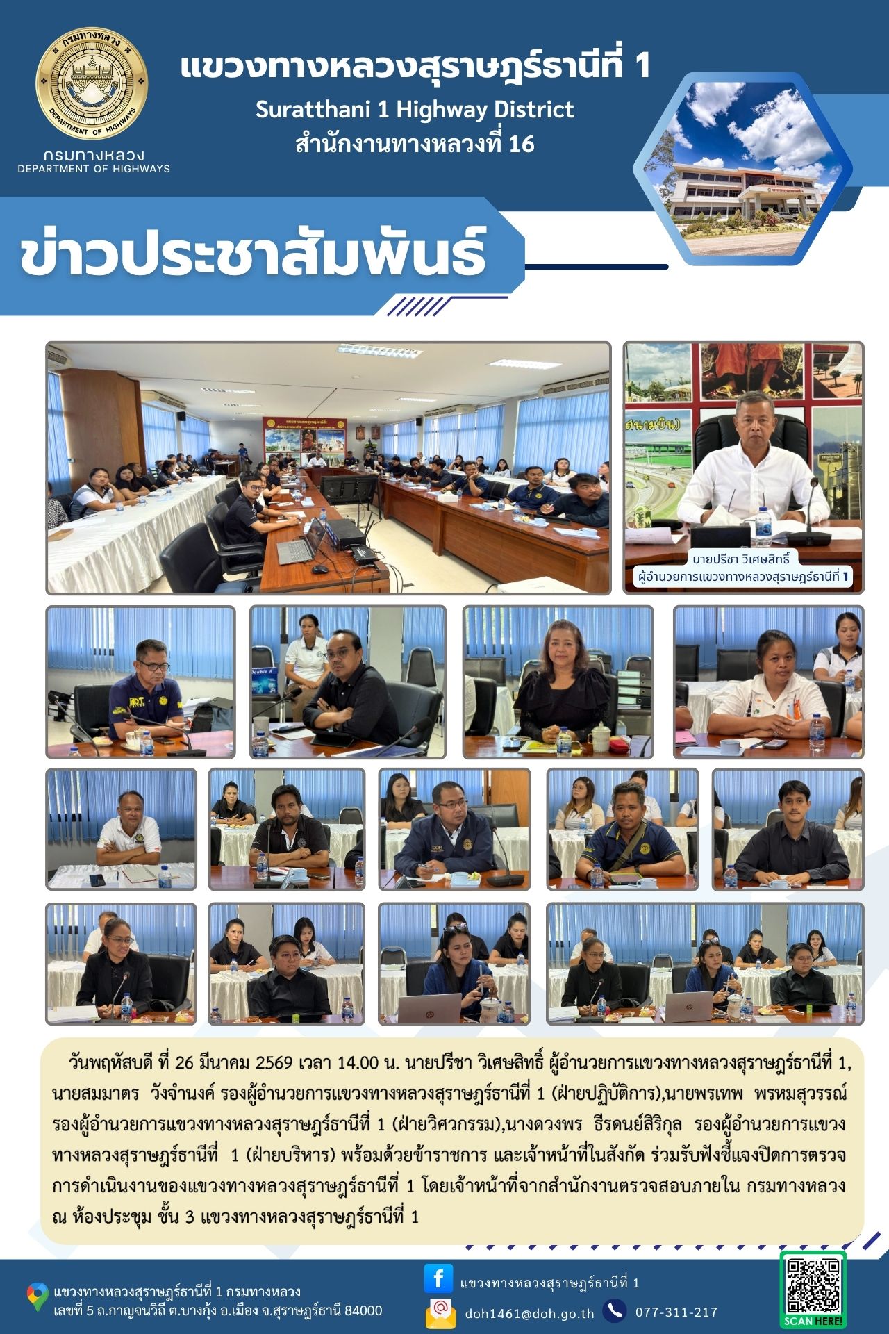 วันพฤหัสบดี ที่ 26 มีนาคม 2569 เวลา 14.00 น. นายปรีชา วิเศษสิทธิ์ ผู้อำนวยการแขวงทางหลวงสุราษฎร์ธานีที่ 1,นายสมมาตร วังจำนงค์ รองผู้อำนวยการแขวงทางหลวงสุราษฎร์ธานีที่ 1 (ฝ่ายปฏิบัติการ),นายพรเทพ พรหมสุวรรณ์ รองผู้อำนวยการแขวงทางหลวงสุราษฎร์ธานีที่ 1 (ฝ่ายวิศวกรรม),นางดวงพร ธีรดนย์สิริกุล รองผู้อำนวยการแขวงทางหลวงสุราษฎร์ธานีที่ 1 (ฝ่ายบริหาร) พร้อมด้วยข้าราชการ และเจ้าหน้าที่ในสังกัด ร่วมรับฟังชี้แจงปิดการตรวจการดำเนินงานของแขวงทางหลวงสุราษฎร์ธานีที่ 1 โดยเจ้าหน้าที่จากสำนักงานตรวจสอบภายใน กรมทางหลวง ณ ห้องประชุม ชั้น 3 แขวงทางหลวงสุราษฎร์ธานีที่ 1